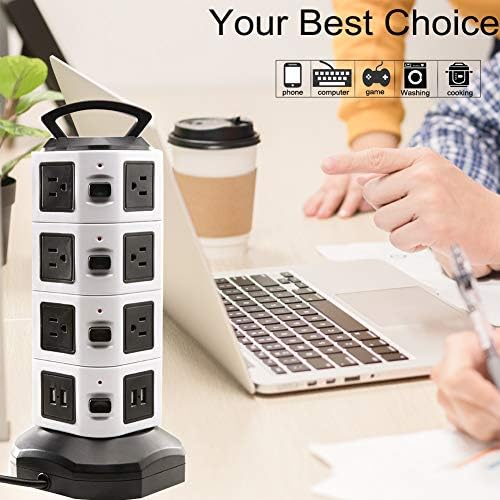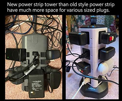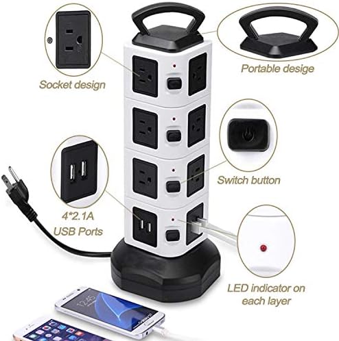 Why Choose lazyElf Power Strip Tower Surge Protector Electric Charging Station? 1, Safe and Reliable: because our products have overload protection, lightning protection and surge protection to ensure your safety and equipment 2, Safety Assurance: with CE, FCC safety certification. Use flame retardant materials + safety ABS 3, Multi-Socket and Multiple USB Ports: convenient for your home life and save office space, beautiful .2.1A USB port can quickly charge multiple devices 4, The Use of Better Quality Conductive Materials: our products use better than pure copper phosphorus, oxidation resistance, hardness, toughness are better than pure copper, improve the product’s stable conductivity and service life, reduce you unnecessary trouble. 5, Intimate design: 1 control button per layer, low carbon energy saving. Anti-slip design at the bottom 6, The price is cheap and affordable Parameters: Rated Voltage: rated voltage 125V~230V(MAX) Rated Current: 13A Rated Power: 1625W (125v)~3000W (230v) Frequency: 50HZ / 60HZ Material: ABS + fireproof material USB Rated Voltage: USB 5V USB Rated Current: 2.1A Retractable Extension Cord: 6.6 feet /2M 14 Outlet Plugs + 4 USB Ports There are independent switches and independent indicators ★★★Safety attention: Do not touch the Power Strip Tower when the hand is wet Do not use the Power Strip Tower in the wet environment