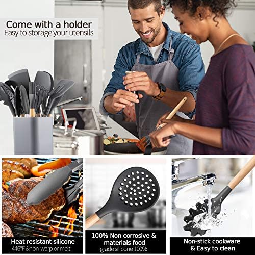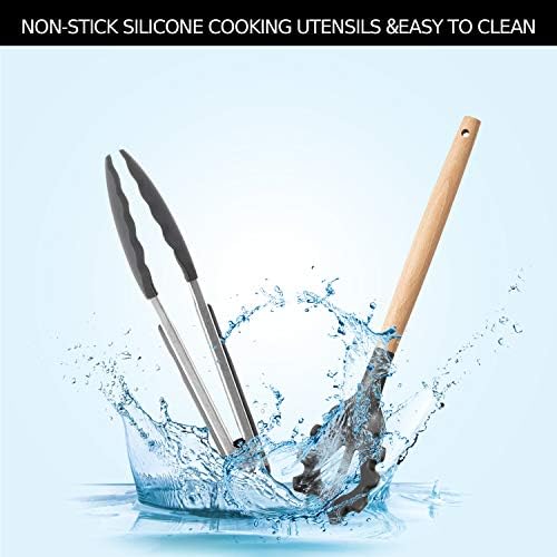 【EASY TO CLEAN】This quality kitchen silicone utensil set is easy to wash, simply wipe under hot water.Perfectly safe to hand wash or feel free to throw them in the dishwasher.Washing hand recommend, The best way to clean these silicone cookware is gently rinsing in warm water. no worry the wooden handle will be mold, circular opening at the bottom ensures that the silicone cooking utensils in the holder is always kept in a dry environment.