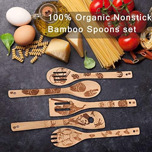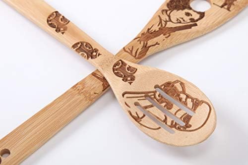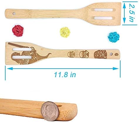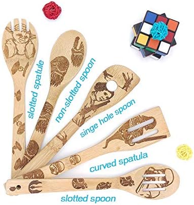 💘 FUNNY UNIQUE CARTOON PATTERN WOODEN SPOONS SET:carved spatulas,solid spoon,single holde spoon,slotted spatula,non-slotted spoon,5 pieces of utensils to meet all your cooking needs, lightweight and durable solid wood kitchen utensils.