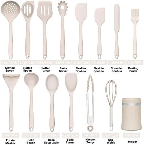 🌻【PROFESSIONAL SILICONE KITCHEN UTENSILS SET】24 Kitchen utensils set includes slotted spatula, slotted spoon, solid spoon, pasta serve, kitchen tongs, spoon spatula, whisk ,deep soup ladle, spatulas and flexible spatula, holder, basting brush, spreader spatula, slotted turner, measuring spoon and measure cups. The variety of kitchen tools ensure you has exactly what is needed at hand for the perfect meal every time