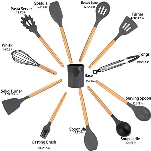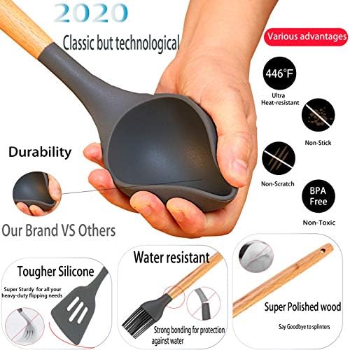 💎【PREMIUM FOOD GRADE SILICONE UTENSIL SET &HEAVIER FEELING IN YOUR HAND】Food grade silicone, BPA-free silicone heads not react with food or beverages, not bend or break like other cheap silicone kitchen utensils. Durable hard wooden handles have great heat insulation, without being worn down.the silicone set uses more materials than other products on the market, and the wooden handle part is produced by injecting silica gel, which makes the product Connect better, Never separate!