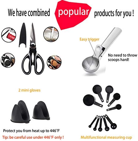 🎁【PERFECT COMPLETE COOKING SET FOR GIFT】Our products are packed with a strong holiday atmosphere color box. It is a perfect choise to your friends as a gift for moving into new home, or your wife/husband !Our kitchen utensil set comes complete with the most in demand pieces that you need in your kitchen,including a complete set 1 cute ice cream spoon,10 Measuring spoon and 2 mini gloves1 Multifunctional scissors。I believe this set of kitchen utensils will be your best friend in kitchen.