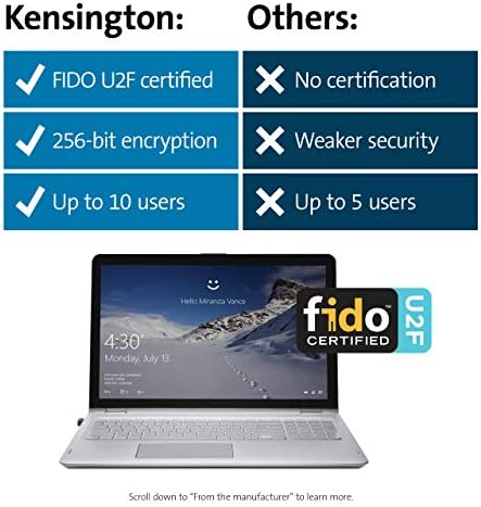 Login on your Windows computer (for Windows 10 please download the latest driver from the Kensington website) using Microsoft’s built-in Windows Hello login feature with just your fingerprint, no need to remember usernames and passwords; can be used with up to 10 different fingerprints so multiple users can login to the same computer