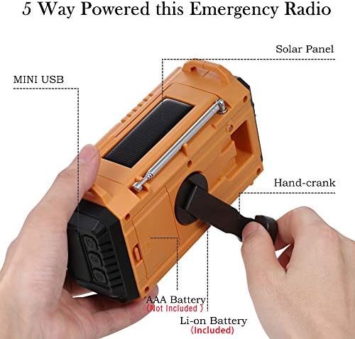 5 Way Power Sources Weather Radio with Crank Handle/Solar Panel/Rechargeable Li-ion Battery/USB Charging Port/AAA Batteries