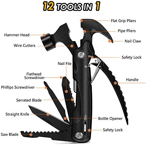 🔧ALL IN ONE MULTIFUNCTION SET: This 12 in 1 camping gear includes Hammer, Nail Claw, Flat and Pipe Grip Pliers, Wire Cutter, Flathead and Phillips Screwdriver, Saw, Straight and Serrated Blade, File, Bottle Opener, and Durable nylon carrying case with belt holster. It works well during camping, exploring, fishing, field training and long-distance travel.