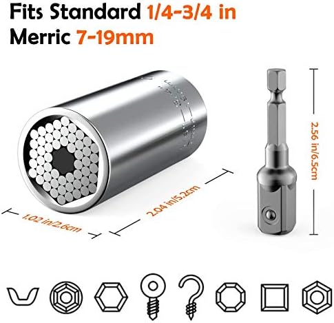 Biuonk Universal Socket fits both standard 1/4 to 3/4 inch and metric 7 to 19 mm nuts and bolts. It can also grasp hex, nuts, square, eyes, tension, flange screws, bolt heads, even worn and damaged heads!