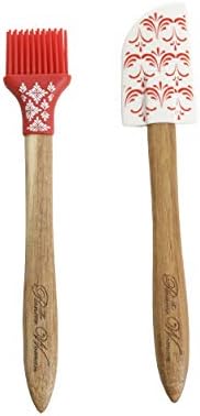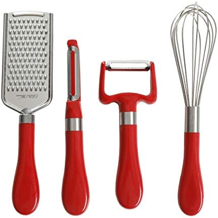 Set includes: peeler, Y-shape julienne peeler, grater, whisk, tongs (stainless steel blades with bakelite handles); spatula, spoon, basting brush (silicone head with acacia wood handles); acacia wood turner; 4 measuring spoons, 4 measuring cups, large measuring cup, spoon rest (melamine); and wood cutting board