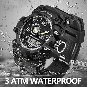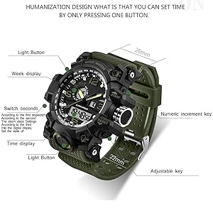 MULTIFUNCTION: 1. Analog and digital dual dial support two different timezone 2. Alarm 3. LED Back Light(show time clear in the dark ) 4. Calendar Day and Date 5. Stop Watch 6. 12/24H format option 7. Shock Resistant. Those funktions make it perfect for all kind of sport and daily use