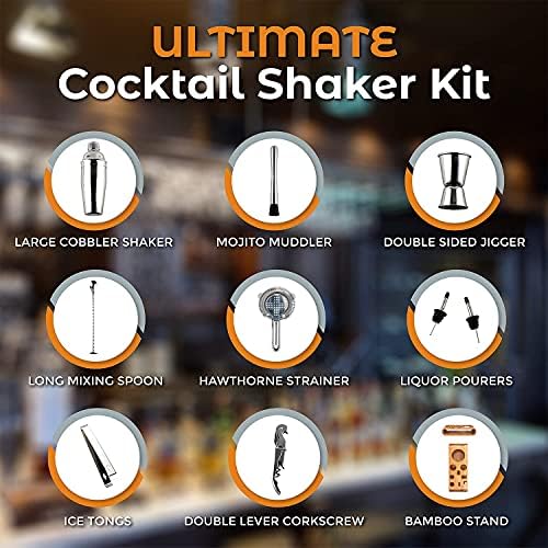 Ultimate Cocktail Shaker Kit – includes Large Cobbler Shaker – 25oz/750ml, Double Sided Jigger – 0.5/1 oz (15/30 ml), Hawthorne Strainer, Liquor Pourers, Cocktail Muddler, Bar Spoon, Ice Tongs, Double Lever Corkscrew, Bamboo Stand and Bonus 4x Stainless Steel Straws and Cleaning Brush.