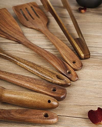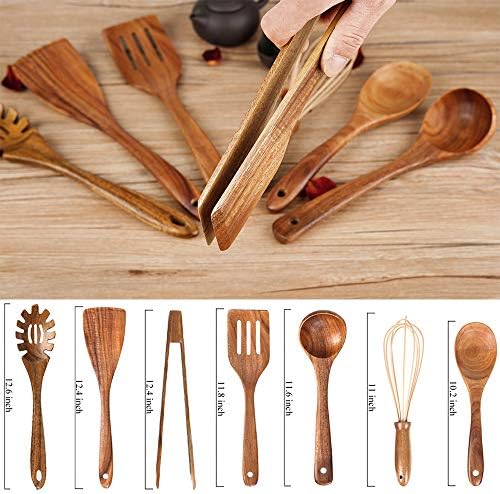 WIDELY APPLICABLE–An eco-friendly addition to your kitchen this value set of 7 pcs wooden cooking utensils set includes 1 * Tong.1 * Spaghetti server.1 * Slotted spatula.1 * Fried spatula.1 * Soup ladle. 1 * Mixing spoon.1 * Egg whisk(silicone+wood).Hanging loop for easy storage.