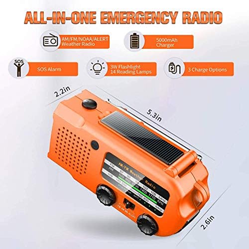 Emergency Radio, 5000mAh Hand Crank Solar Weather Radio, NOAA/AM/FM Portable Radio with LED Flashlight and 14 Lamps Reading Lamp, USB Cell Phone Power Charger, SOS Alarm for Home, Camping or Survival. This Multi-Function Emergency Radio is a must-have for emergencies and braving the elements.This Solar-Powerd Crank Radio has FM/AM/WB stations that keep you up-to-date and connected in any situation.It’s equipped wit Powerful Li-ion Battery ,which is not only sufficient for satisfying daily need but also can be used as a power band to charge external device.And it has multiple powered methods-solar panel,hand crank and Micro USB.Furthermore,it is equipped with bright flashlight,reading lamp and SOS siren.Various survival methods prevent you far from peril.