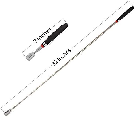 Magnetic Pickup Tool- Led Light Telescoping Handle Magnet Pick Up 8 lb Lift Capacity By bogo Brands — Easily find small parts or pieces during automotive repairs or construction projects. Locate anything from nails to misplaced car keys. Super bright LED light illuminates dark tight places, cracks, and crevices so you can see what objects the magnet is picking up. Helps to grab objects in far to reach places. Retrieve items like nuts, bolts, screws, nails, sewing pins, sewing needles and much more. Designed to safely clear away small and larger pieces of metal debris from outdoor and indoor work areas. Prevents injury from picking up sharp metal pieces by hand. Magnetic retrieving tool has rubber grip handle, metal rod, 7.5 long unextended, 32 fully extended, 8 pound magnet lift capacity with super bright LED light.